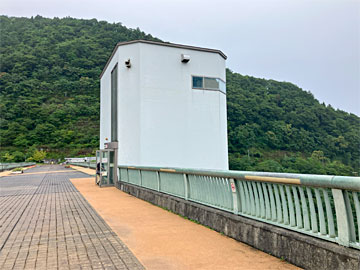 ダムの中央付近、下流側に建物があります