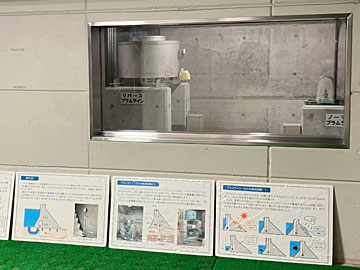 1Fにあった、リバースプラムライン(左)、ノーマルプラムライン(右)の展示。どちらもダムのたわみを観測し安全性を確認するための装置で、ダムは夏場は上流側、冬場は下流側に変形し(傾き)、夏と冬の変異差は15mm程度になるのだそう。