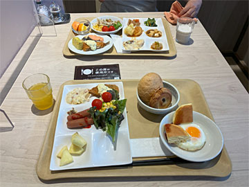 ホテルルートインは無料でバイキング朝食を提供しています。ルートインの朝食は(無料にしては)豪華だ、と聞いていましたが、確かに品種が多くておいしかった。目玉焼きとか目の前で焼いていました。