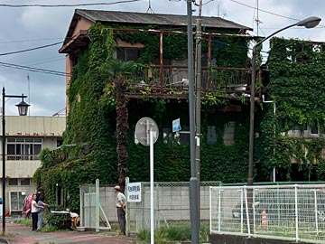 蔦(つた)のかかった3階建ての古い建物(6)。うなぎ屋さんで 軒先のいけすで うなぎが泳いでいました。