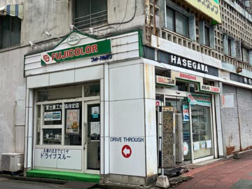 「DRIVE THROUGH」という文字と矢印が描かれたカメラ店(196)。こんな時代もあったのですね。
