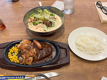 昼前になったので、ガスト 太田駅前店でランチ。鉄板ハンバーグミックスグリルと冷やし豆乳坦々うどん。