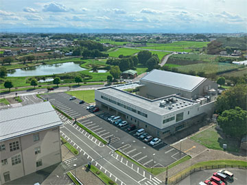 左が邑楽町(おうらまち)役場、右が邑楽町中央公民館。遠くの山々は秩父方向。
