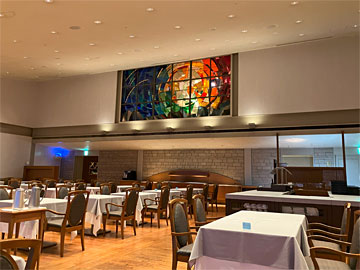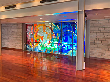 ロビーのステンドグラスは、ルイ・フランセンの「自然のエネルギー」。裏側はレストラン。