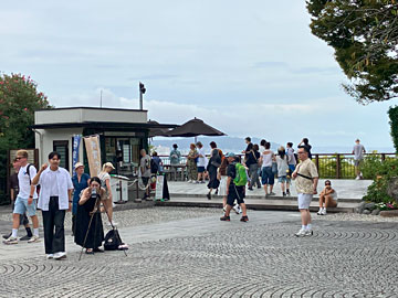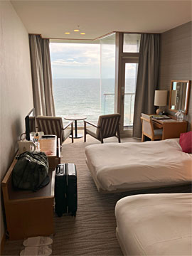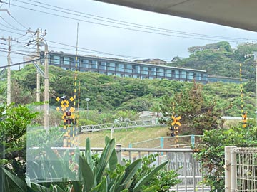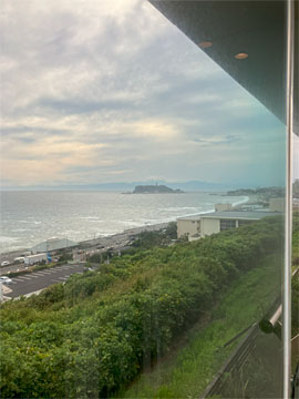 フロントロビーからバンケットホールまで斜行エレベーターで降ります(1分半)。バンケットホールから出て、海沿いを歩いて七里ヶ浜駅に行きます。