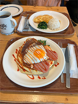 ソーセージミートエッグパンケーキと、ガーリックシュリンプオムレツ(どちらも¥1,400)、セットコーヒー(¥250)。