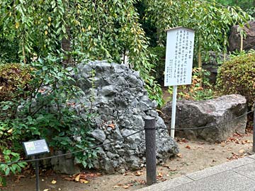 この石は国歌「君が代」に歌われるさざれ石「細石」です。石灰岩が長い年月をかけ溶解し、小石を凝結してこのような形状の石となりました(立札)。