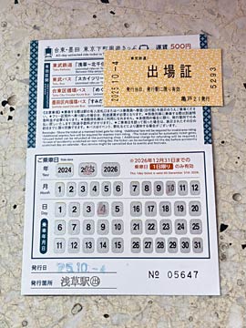 東武線の浅草駅で「台東・墨田 東京下町周遊きっぷ」を買いました。1日券は¥500(連続2日券もある¥700)。何と、自分で使う日を スクラッチ して使います。