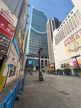 東急歌舞伎町タワーに来てみました。手前の広場はシネシティ広場(トー横広場)。人が入れないようにバリケードが張ってあり、ハトがいっぱいいました。