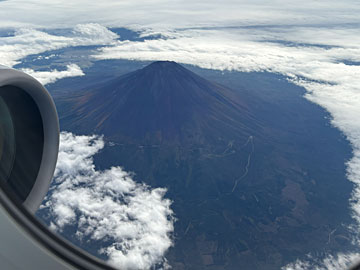 今回もANAのマイルで飛びます。羽田から山口宇部空港に行くANA693便。左手に黒々とした富士山が見えました。