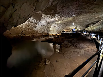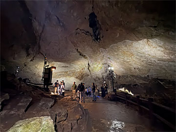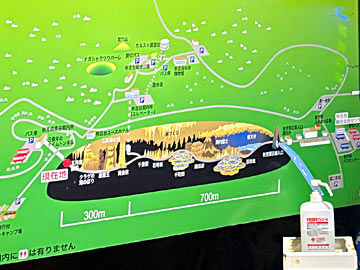 タイムトンネルを抜けるといよいよ洞内。壁の洞内図。300mほど行ったところに、先ほど行った「カルスト展望台」の方に上がるエレベーターがあります。