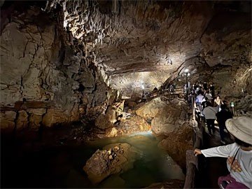 今まで、沖縄の玉泉洞、日原鍾乳洞、福島のあぶくま洞に行ったことがあります。沖縄は観光洞800m、日原は350m、福島は公開部600m。今回の秋芳洞は観光コースだけで1kmとのことで、確かに距離があり、迫力もありました。