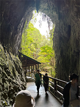 始めて来ました「秋芳洞と秋吉台」。(一般的に)鍾乳洞は昔海底だったころの貝類やサンゴが石灰石になった地層が地上に隆起し、雨の酸性成分で溶けて、ぽっかり開いた穴です。秋吉台にも、灰色の石灰石が羊の群れのようにポコポコあり、雨は穴に抜けるので、地上に川はありません。秋芳洞は(最初に入ったところが広くていかにも洞窟風なので)やっぱり正面から入るのが印象的には良さそう。でも、往復することになりそうなので(循環バスはあるが、洞内にかかる時間が読めない)我々は、奥側(黒谷口)にバスで行って戻って来ました。基本下りだったので登りよりは楽でしたが、濡れて足元は悪く、力を入れて歩いたので、足が疲れました。