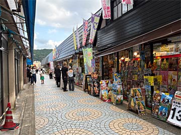 秋芳洞商店会。ここの土産物屋さんは、ソフトクリームや土産物など、割合賑わっていました。
