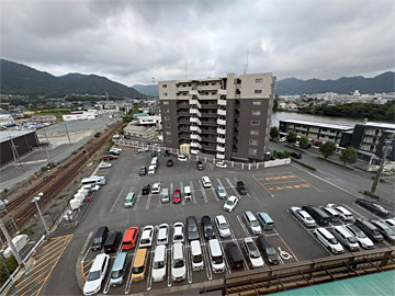 窓からの風景、駐車場ビュー。左に線路が見えます。