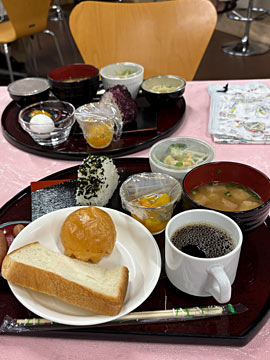 朝食付きプラン。3Fの朝食会場にカードキーを押しあてて入ります。地元山口県産のコシヒカリをつかったおにぎりや焼き立てパンだそう。