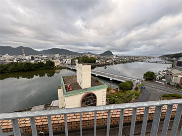 最上階(8F)に展望デッキがある、というので行きました。8Fから階段をさらに上がった屋上でした。萩の中心地方向。手前の川は、松本川。