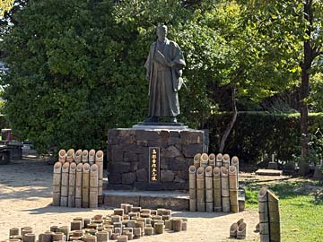 高杉晋作立志像。下にたくさんある竹には、夕方 中に入れた短いロウソクに火がともるのだそう。