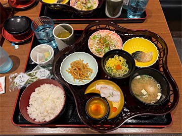 1Fのラーメン屋さんで、朝食が提供されます。ここはバイキングではなく和食で、ご飯の量(大中小)だけ選択できます。