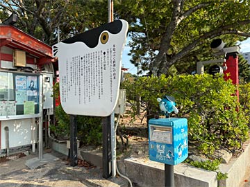 「本場『ふく料理』の由来」という看板と、フグが乗った青い郵便ポスト。
