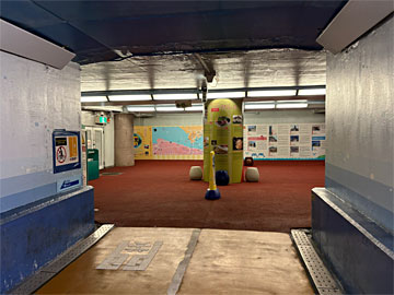 有料エリア内部。最初に入場券のQRコードをかざして顔写真を撮り、モニターの所でQRコードをかざすと、選択問題に自分の顔が出て来たり、ゲームが出来たりします。中央の大スクリーンには時々映像が流れます。