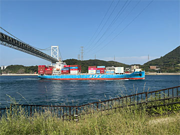 コンテナ船が通ります。この時の海峡は 左から右に かなりの流れがありました。このあと、また歩いて下関に戻りました。