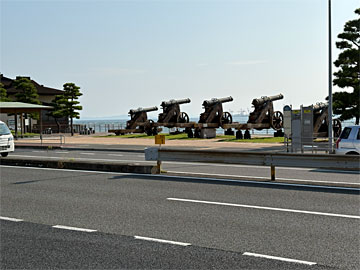 下関口の前で海を向いた4門の大砲は、長州藩が関門海峡を通る外国船を5回にわたって砲撃した際のレプリカ。この後に四国連合艦隊の報復によりすべての砲台が占領・破壊されたとのこと。
