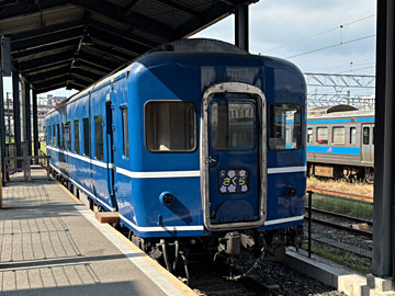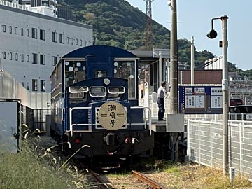 駅の周りを散策していたら、ちょうど遮断機が下りて、バックで入ってきた門司港レトロ観光列車「潮風号」(Wiki)。