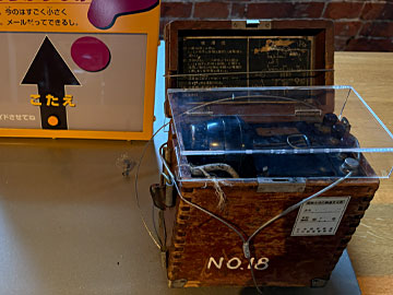 これはなんだろう?どう見ても有線電話機ですが、ダイヤルは無くて、くるくる回して交換手を呼び出す昔のタイプ。