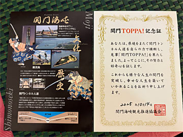先ほど歩いてきて2つのハンコを押した「関門海峡横断記念の紙」を見せて、関門TOPPA!記念証をもらいました。
