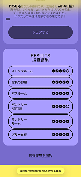 6部屋全て終了しました。スマホに(壁に書いてある)1837を入れると終了できます。当方は28個見つけました。