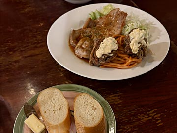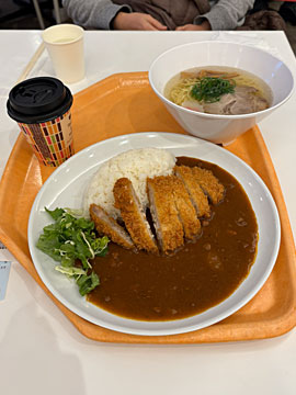 レストラン「ラ・ピシーヌ」で早めの夕食。塩ラーメン¥880 とカツカレー¥1,080。夕日が沈むまで、暖かいところで待つ作戦。