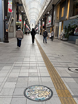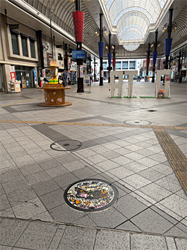 アーケードの中で、南蛮渡来物語のカラーマンホールを発見
