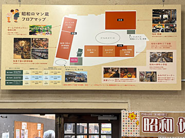 2館共通券[駄菓子屋の夢美術館と昭和の夢町三丁目館]を購入(JAF割で¥810)。フロアマップの左下が駄菓子屋の夢博物館(一部有料)、左上は入らなかったチームラボギャラリー。下側が左から民家ゾーン(一部有料)、おみやげコーナー、昭和の夢町小学校(無料)。右上は南蔵(レストラン)。中央はイベントスペース。