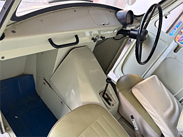 車内。スイッチが2つしかありません。ライトとワイパーでしょうか?(その間にあるのはエンジンをかけるカギ穴)