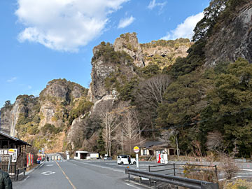 福澤記念館から車で30分弱。「青の洞門」の駐車場に着きました。左手を川(山国川)が流れており、渓谷は耶馬渓と呼ばれる名勝です。