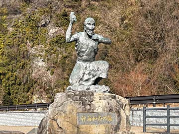 羅漢寺の禅海和尚の像。青の洞門は参拝客が難所を渡る際に命を落とさないよう、禅海和尚がノミ一本で掘り抜いたのだそう。