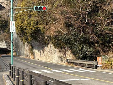 車も通れる新しい道路になっていますが、この道路の下に禅海和尚が堀ったトンネルが残っており、歩道の先に下る階段があります。