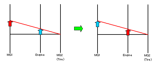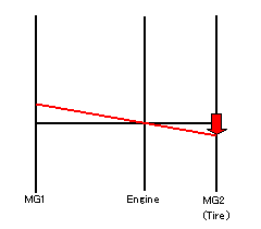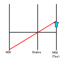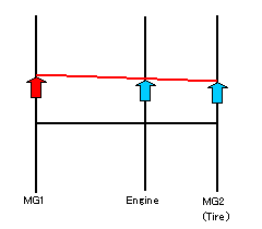 動力分割用プラネタリギアは、サンギアにMG1、ピニオンギアにエンジン、リングギアにMG2とタイヤがつながっているので、MG1とエンジン、MG2(タイヤ)の回転数はいつでも直線関係で結ばれています。
